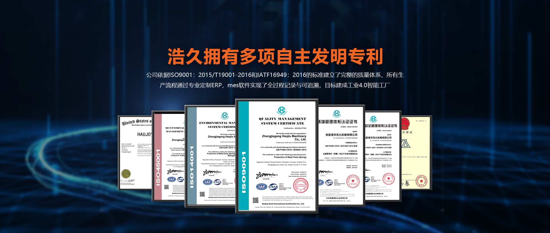 浩久擁有多項自主發明專利。公司依據ISO9001GB/T19001-2016和IATF:2016的標準建立了完整的質量體系,所有生產流程通過專業定制ERP,mes軟件實現了全過程記錄與可追溯,目標建成工業4.0智能工廠。